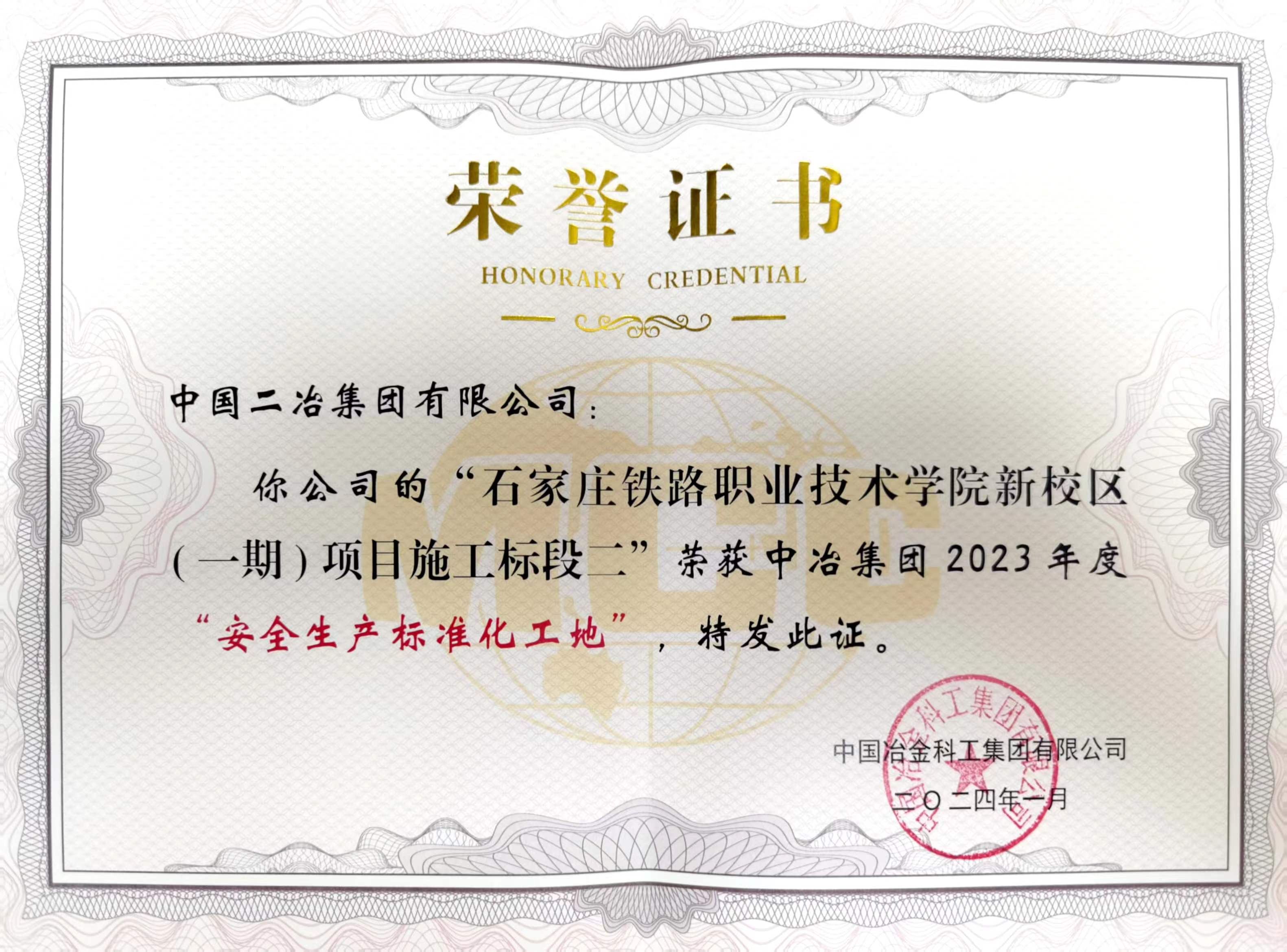 4月24日,房地產公司石家莊鐵路職業技術學院新校區(一期)項目施工標段二項目榮獲中冶集團2023年度安全生產標準化工地。