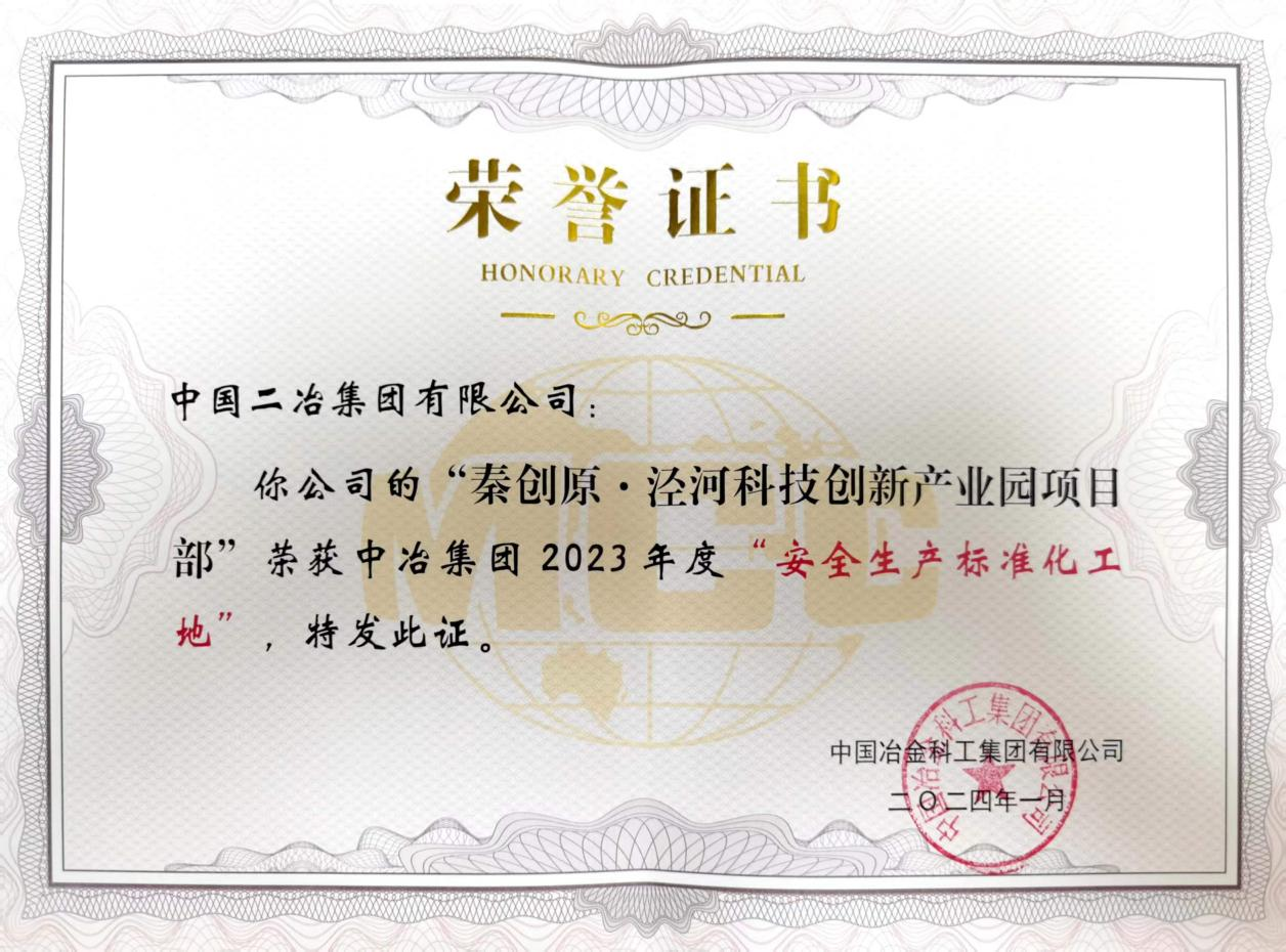 近日,由中國二冶陜西分公司承建的秦創原·涇河科技創新產業園項目榮獲中冶集團2023年度“安全生產標準化工地”榮譽稱號。
