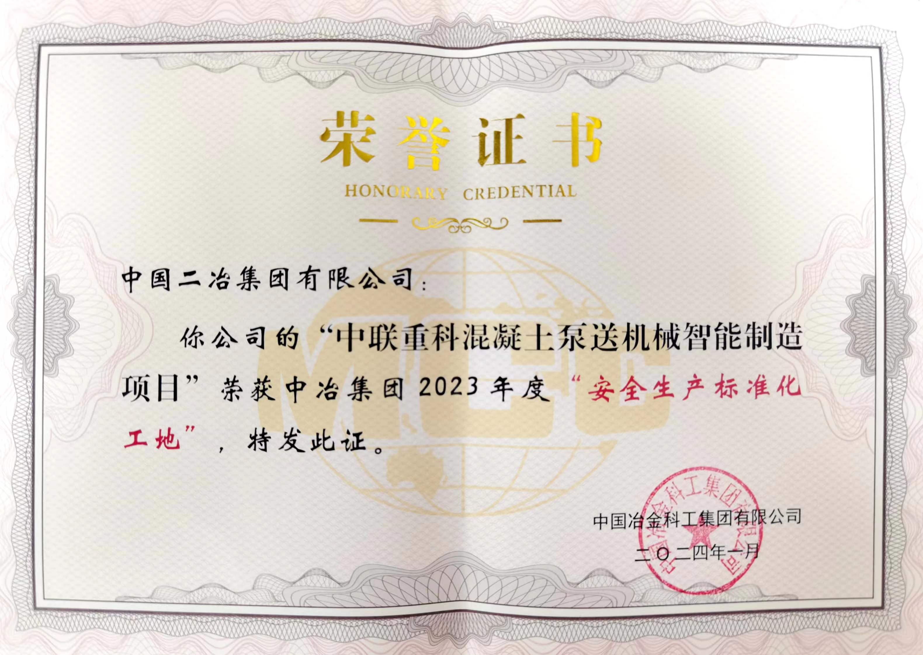 4月23日,湖南分公司中聯重科項目榮獲中冶集團2023年度“安全生產標準化工地”榮譽稱號。