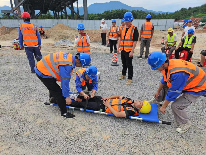 本次活動的場景設置結合了現階段施工現場高處作業及夏季高溫的特點,模擬一名工人因操作失誤而意外墜落的情況。事故發生后,項目部迅速啟動應急預案,各應急小組按照既定程序展開救援行動。演練現場,救援小組迅速到達事故現場,對傷員進行初步救治,并將其轉移至安全地帶;警戒組及時封鎖事故現場,防止無關人員進入;醫療救護組在臨時醫療救護點內對傷員進行進一步救治,并與外部醫療機構取得聯系,確保傷員得到及時有效的治療。