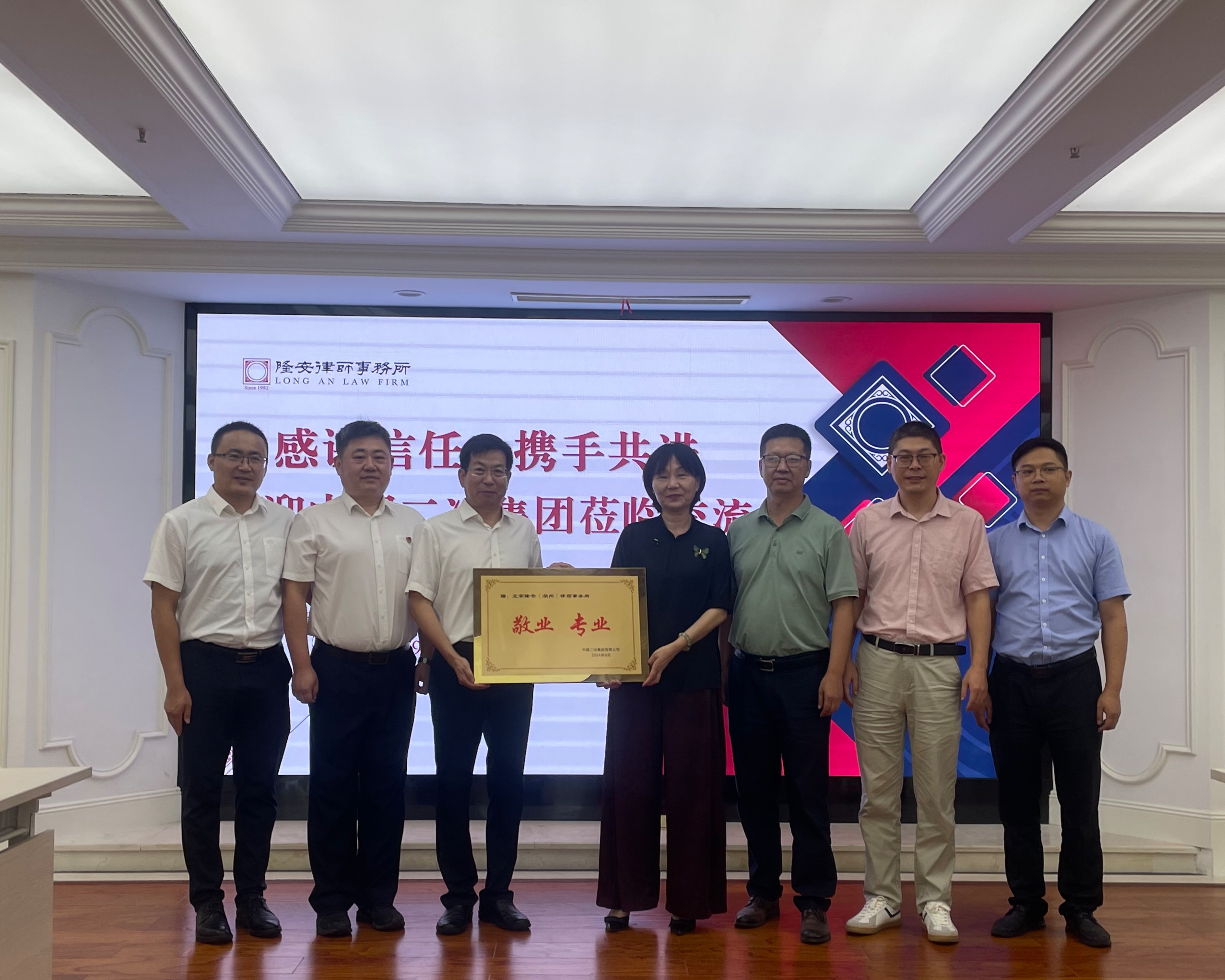 9月19日,路橋分公司黨委書記郭泗東代表中國二冶路橋分公司向浙江片區項目法律合作單位湖州隆安律師事務所贈送 “敬業,專業”致謝牌匾,同時就建筑企業施工生產中如何加強風險防控等相關內容進行了交流座談。