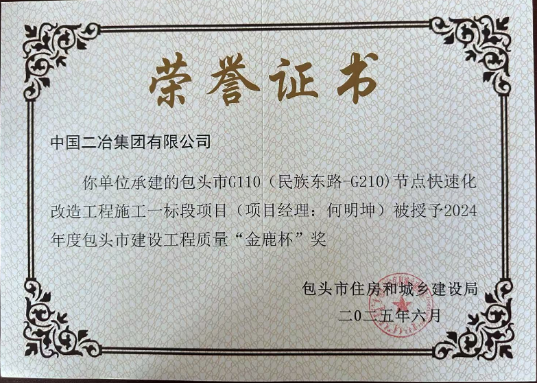 近日,從包頭市傳來喜訊,市政公司包頭市G110(民族東路-G210)節點快速化改造工程施工一標段項目憑借卓越的工程質量和出色的項目管理,成功斬獲包頭市建設工程質量“金鹿杯”獎。這一獎項的獲得,不僅是對該項目全體建設者辛勤付出的高度認可,更是公司在建筑領域實力與口碑的有力見證。?