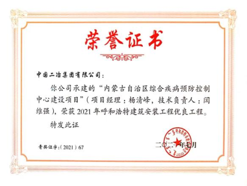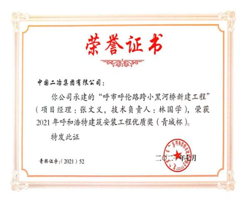 近日,呼和浩特市建筑業(yè)協(xié)會公布了2021年度呼和浩特建筑安裝工程優(yōu)質(zhì)獎的評審結(jié)果。由中國二冶集團內(nèi)蒙古分公司承建的呼和浩特市呼倫路跨小黑河橋工程榮獲建筑安裝工程優(yōu)質(zhì)獎(“青城杯”),內(nèi)蒙古自治區(qū)綜合疾病預防與控制中心項目榮獲“優(yōu)良工程獎”。
