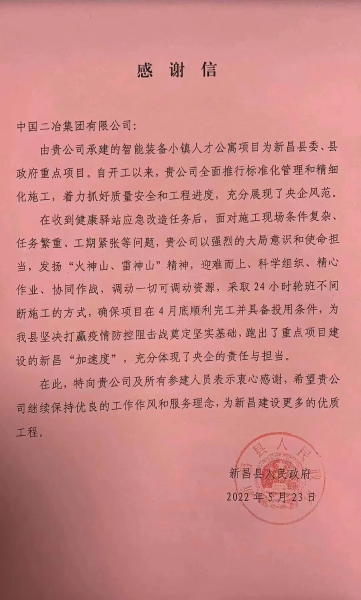 5月24日,中國二冶收到新昌縣人民政府感謝信。信中高度贊揚了中國二冶在新昌智能裝備小鎮人才公寓項目建設中,全面推行標準化管理和精細化施工,全力抓好質量安全和工程進度,晝夜不停,勇挑重擔,充分展現央企擔當。