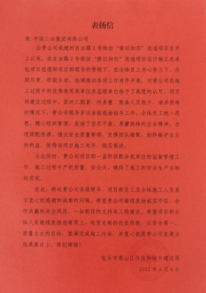 6月10日,中國(guó)二冶收到包頭市青山區(qū)住房和城鄉(xiāng)建設(shè)局發(fā)來的表?yè)P(yáng)信。信中贊揚(yáng)中國(guó)二冶在青山區(qū)自由路2號(hào)街坊“修舊如舊”改造項(xiàng)目建設(shè)過程中,攻堅(jiān)克難,精細(xì)部署,有序推進(jìn),以實(shí)際行動(dòng)充分體現(xiàn)了二冶人的實(shí)干擔(dān)當(dāng)。