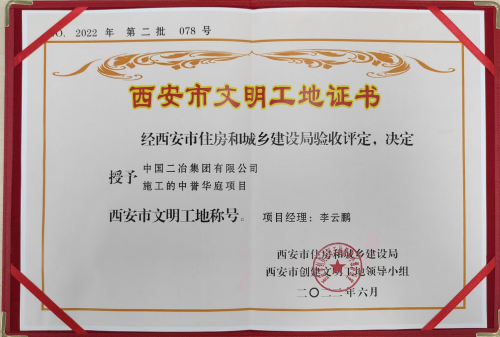7月5日,中國二冶收到西安市住房和城鄉建設局頒發的榮譽證書及獎牌,由中國二冶承建的中譽華庭項目榮獲西安市“文明工地”榮譽稱號。