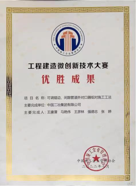 7月29日-30日,由中國施工企業管理協會主辦的2022年工程建設行業科技工作會議暨科技成果競賽交流會在杭州召開。會上,由中國二冶選送的“可調錯邊、間隙管道外對口器組對施工工法”榮獲第二屆工程建造微創新技術大賽優勝成果獎;“大口徑長輸管道大跨度整體吊裝施工方法”榮獲第二屆工程建設行業高推廣價值專利大賽三等獎。