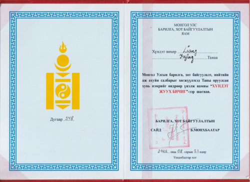 證書譯文指出,中國援建、中國二冶承建的蒙古國棚戶區改造項目自6月15日開工以來,克服疫情、通關、人員進出等困難,為蒙古國建設、城市發展和公共事業發展做出突出貢獻并受到高度評價,在蒙古國建筑節即將到來之際,蒙古國建設部向中國二冶頒發榮譽證書。