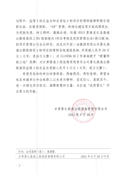9月28日,甘肅景禮高速公路隴南管理有限公司發布通報,對中國二冶甘肅分公司景禮項目部在“質量樣板工地”評比中獲得優異成績進行通報表揚,景禮項目部二號梁場榮獲“質量樣板工地”獎牌,并給予20萬元嘉獎。
