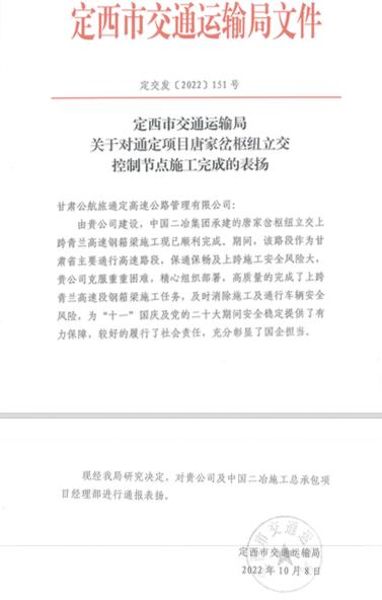 10月21日,中國二冶通定高速項目部收到來自定西市交通運輸局的表揚信,對中國二冶通定高速項目部管理團隊按時完成節(jié)點目標表示高度肯定。