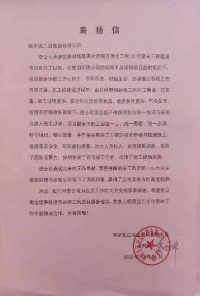 10月21日,中國二冶南鋼項目部收到來自業(yè)主單位南京金江冶金爐料有限公司原料廠的表揚(yáng)信,對中國二冶冶金分公司南鋼項目部在承建的原料廠環(huán)保封閉提升優(yōu)化工程C2倉建安工程項目建設(shè)過程中講信譽(yù)、重合同、保履約給予表揚(yáng),同時對項目部的嚴(yán)格管理以及優(yōu)秀的工作態(tài)度表示贊賞。