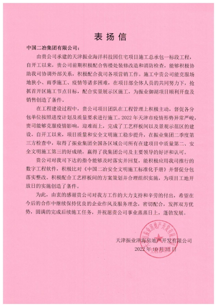 11月1日,中國二冶天津振業(yè)海洋科技園住宅一標(biāo)段項目部收到天津振業(yè)津海房地產(chǎn)開發(fā)有限公司表揚信,對中國二冶天津振業(yè)海洋科技園住宅項目在施工過程中能夠克服疫情影響,保證施工進(jìn)度、質(zhì)量及安全文明提出表揚。