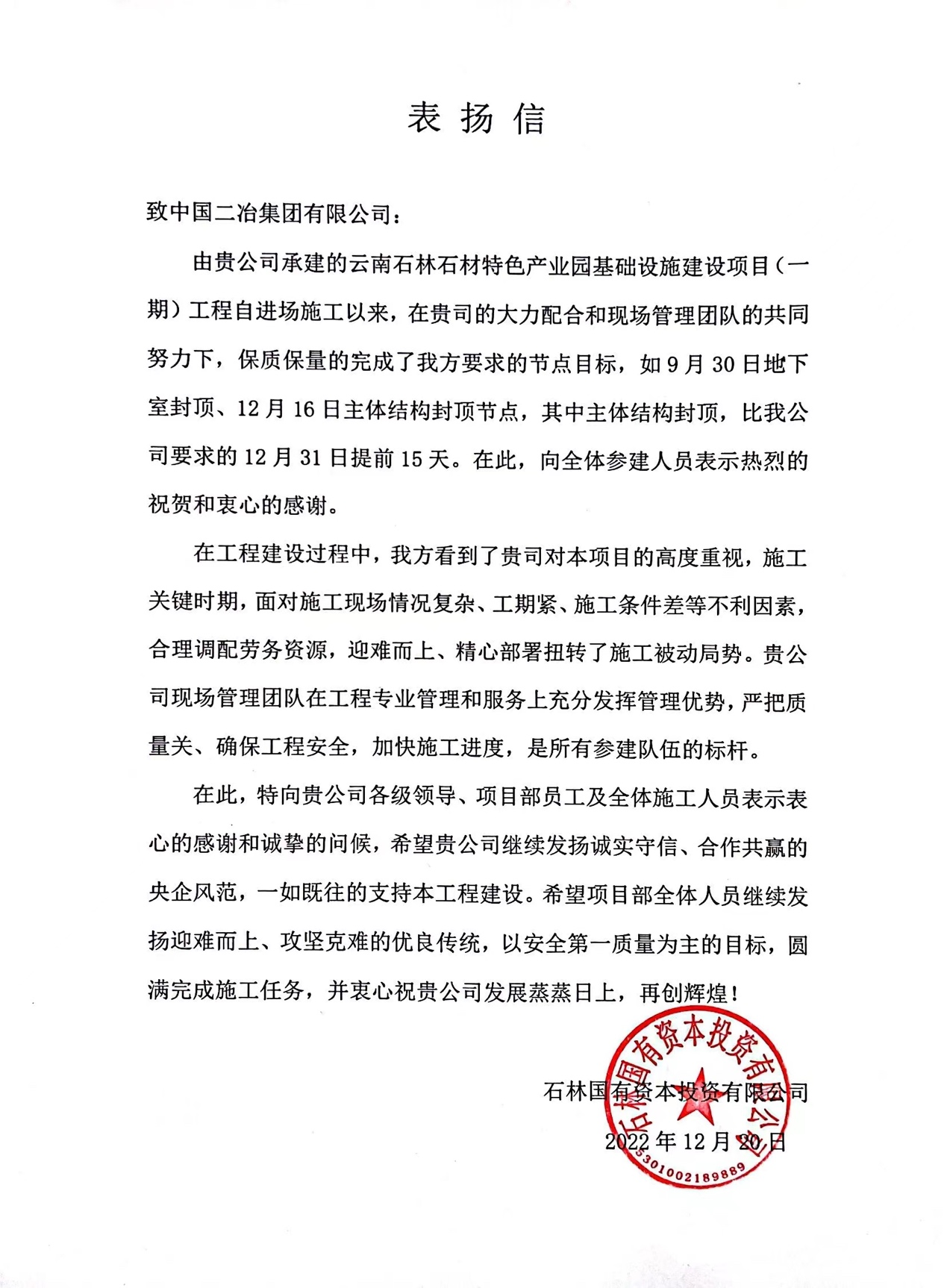 此封表揚信,既是石林國有資本投資有限公司對中國二冶石林項目管理團隊在施工建設中辛勤付出的充分肯定,也是對項目后續(xù)工作的鼓勵,項目部全體人員將繼續(xù)發(fā)揚央企優(yōu)良作風,奮勇爭先,持續(xù)高質(zhì)量推進工程建設。