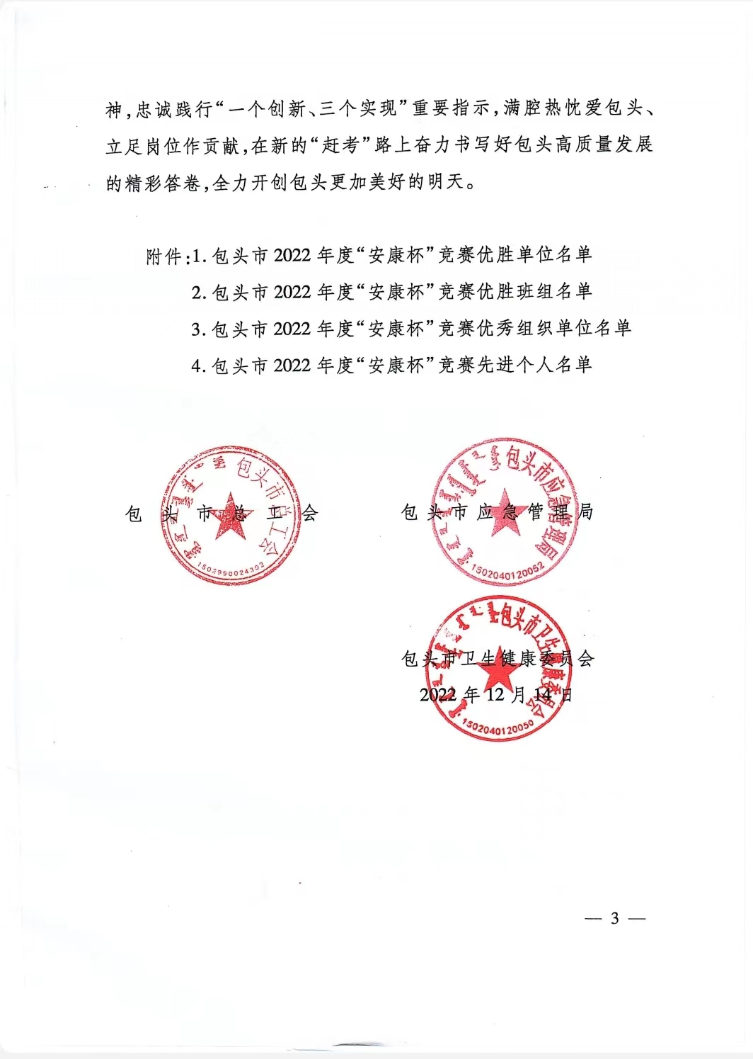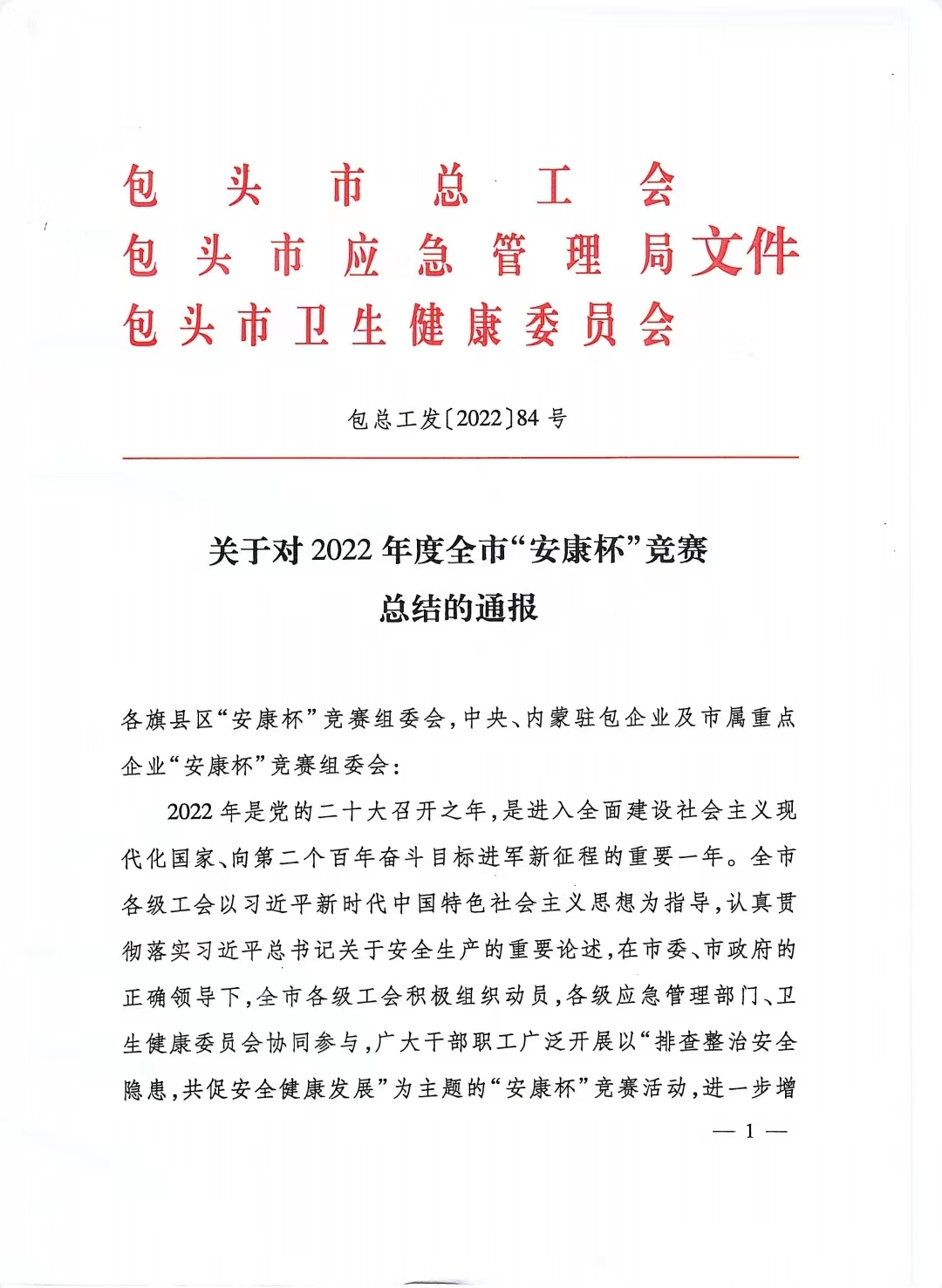 “安康杯”競(jìng)賽活動(dòng)是由包頭市總工會(huì)和包頭市應(yīng)急管理部及包頭市衛(wèi)生健康委員會(huì)聯(lián)合組織的安全生產(chǎn)競(jìng)賽評(píng)比活動(dòng),旨在通過競(jìng)賽安全生產(chǎn)管理、領(lǐng)導(dǎo)者安全生產(chǎn)意識(shí)、職工安全生產(chǎn)知識(shí)水平和能力、安全生產(chǎn)各項(xiàng)指標(biāo)評(píng)比,不斷推動(dòng)企事業(yè)單位的安全生產(chǎn)工作和安全文化建設(shè),不斷擴(kuò)大社會(huì)影響,提高全民安全生產(chǎn)意識(shí),最終降低各類事故的發(fā)生率和各類職業(yè)病的發(fā)病率。