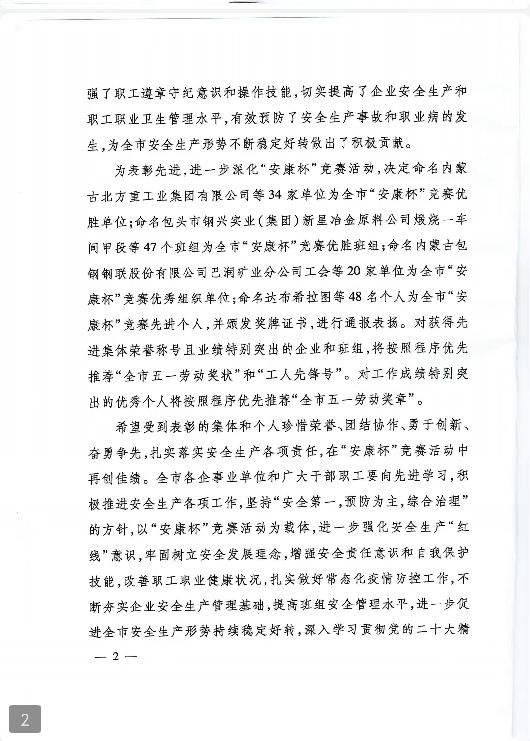 通過開展“安康杯”競(jìng)賽活動(dòng),提高了公司安全生產(chǎn)管理水平和全員安全防范意識(shí),公司安全生產(chǎn)管理和職工勞動(dòng)保護(hù)工作得到全面強(qiáng)化,職工安全生產(chǎn)意識(shí)和勞動(dòng)保護(hù)技能顯著增強(qiáng),生命安全和健康權(quán)益得到有效維護(hù),有力推動(dòng)了公司安全高質(zhì)量發(fā)展和職工“安康”幸福指數(shù)提升。
