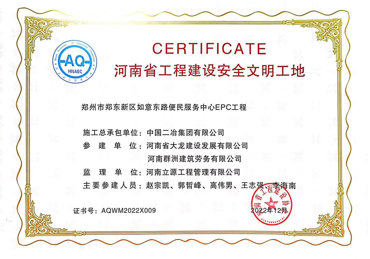 2月8日,從河南省工程建設協會傳來喜訊,中國二冶承建的河南鄭州如意東路便民服務中心項目榮獲河南省2022年度“工程建設安全文明工地”稱號。