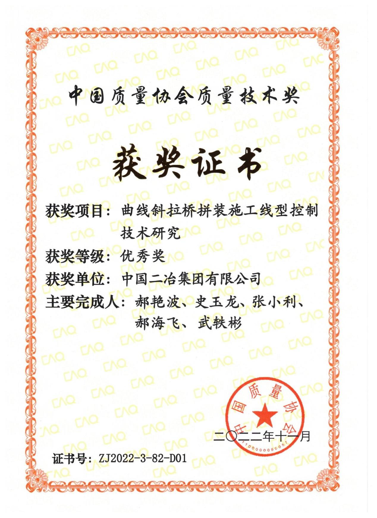 精益求精,鑄就品質(zhì)典范。2月9日,中國二冶收到中國質(zhì)量協(xié)會頒發(fā)的證書,由公司申報的“曲線斜拉橋拼裝施工線型控制技術(shù)研究”榮獲2022年度中國質(zhì)量協(xié)會質(zhì)量技術(shù)進步優(yōu)秀獎。