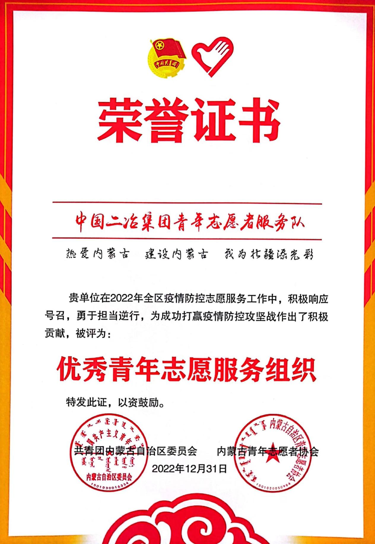 2月13日,共青團(tuán)內(nèi)蒙古自治區(qū)委員會、內(nèi)蒙古青年志愿者協(xié)會授予中國二冶集團(tuán)青年志愿服務(wù)隊(duì)“優(yōu)秀青年志愿服務(wù)先進(jìn)集體”榮譽(yù)稱號。褒揚(yáng)中國二冶青年志愿服務(wù)隊(duì)在抗擊新冠肺炎疫情中的突出表現(xiàn)。