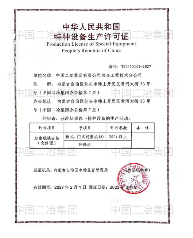 2月14日,中國二冶冶金分公司收到內(nèi)蒙古自治區(qū)市場監(jiān)督管理局頒發(fā)的起重機械特種設備安裝許可證,標志著歷時近一年的起重機械安裝修理取證工作取得圓滿成功。