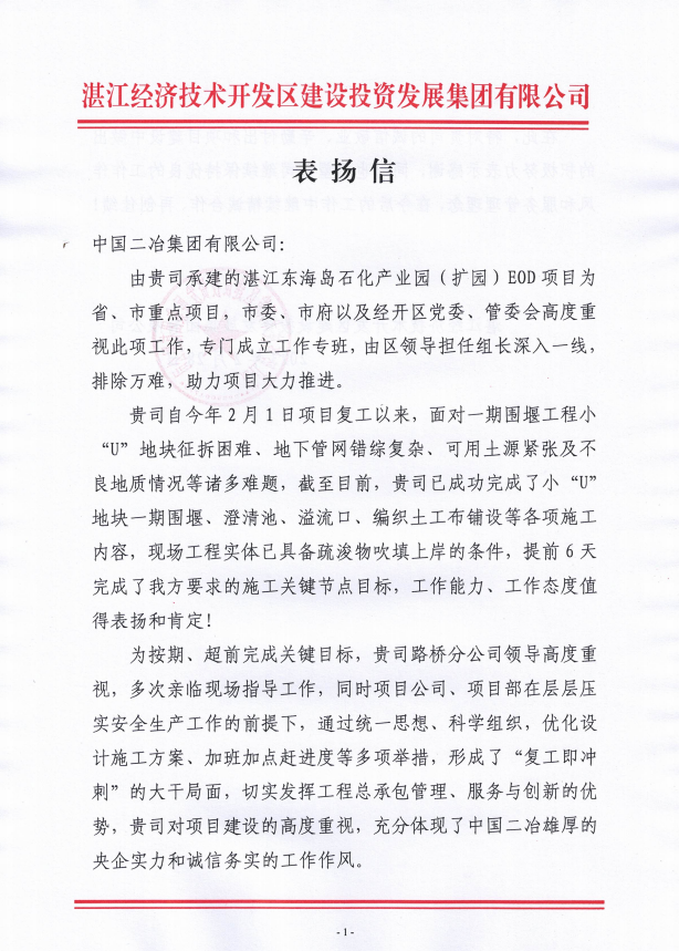 2月28日,中國二冶湛江東海島產(chǎn)業(yè)園(擴(kuò)園)EOD項(xiàng)目收到業(yè)主單位湛江經(jīng)濟(jì)技術(shù)開發(fā)區(qū)建設(shè)投資發(fā)展集團(tuán)有限公司表揚(yáng)信,對中國二冶攻堅(jiān)克難,高效推進(jìn)項(xiàng)目進(jìn)度,超前完成工程節(jié)點(diǎn)和任務(wù)目標(biāo)提出表揚(yáng)與肯定。