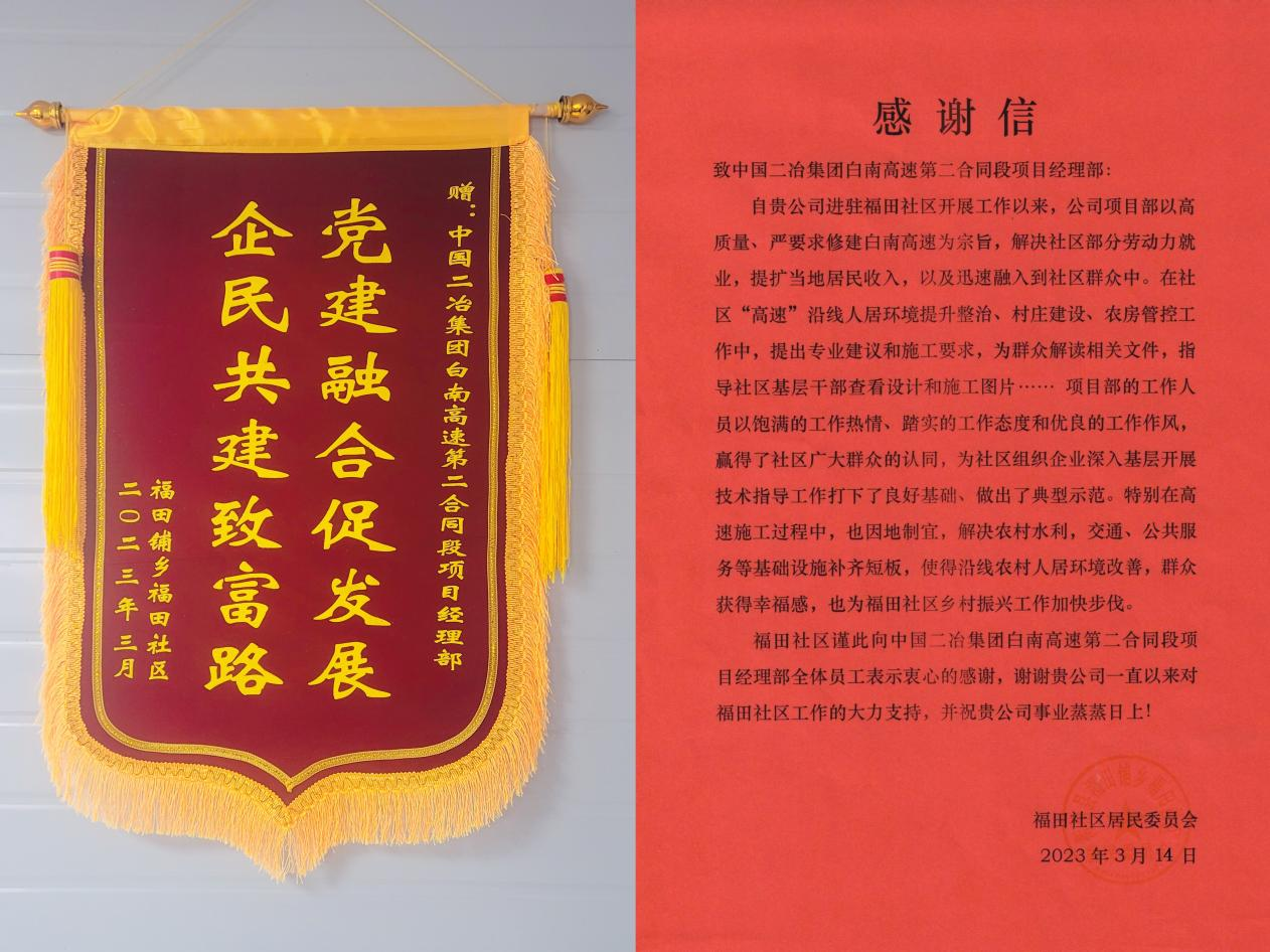 3月14日,湖南省衡陽市衡山縣福田社區居民委員會為中國二冶白南高速第二合同段項目部送來錦旗及感謝信,對項目部駐福田社區以來彰顯出的央企社會責任與擔當給予高度肯定和贊揚。
