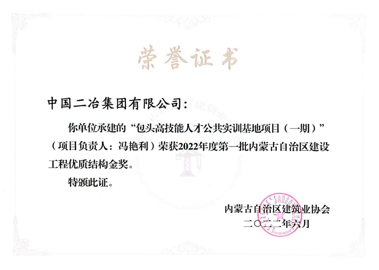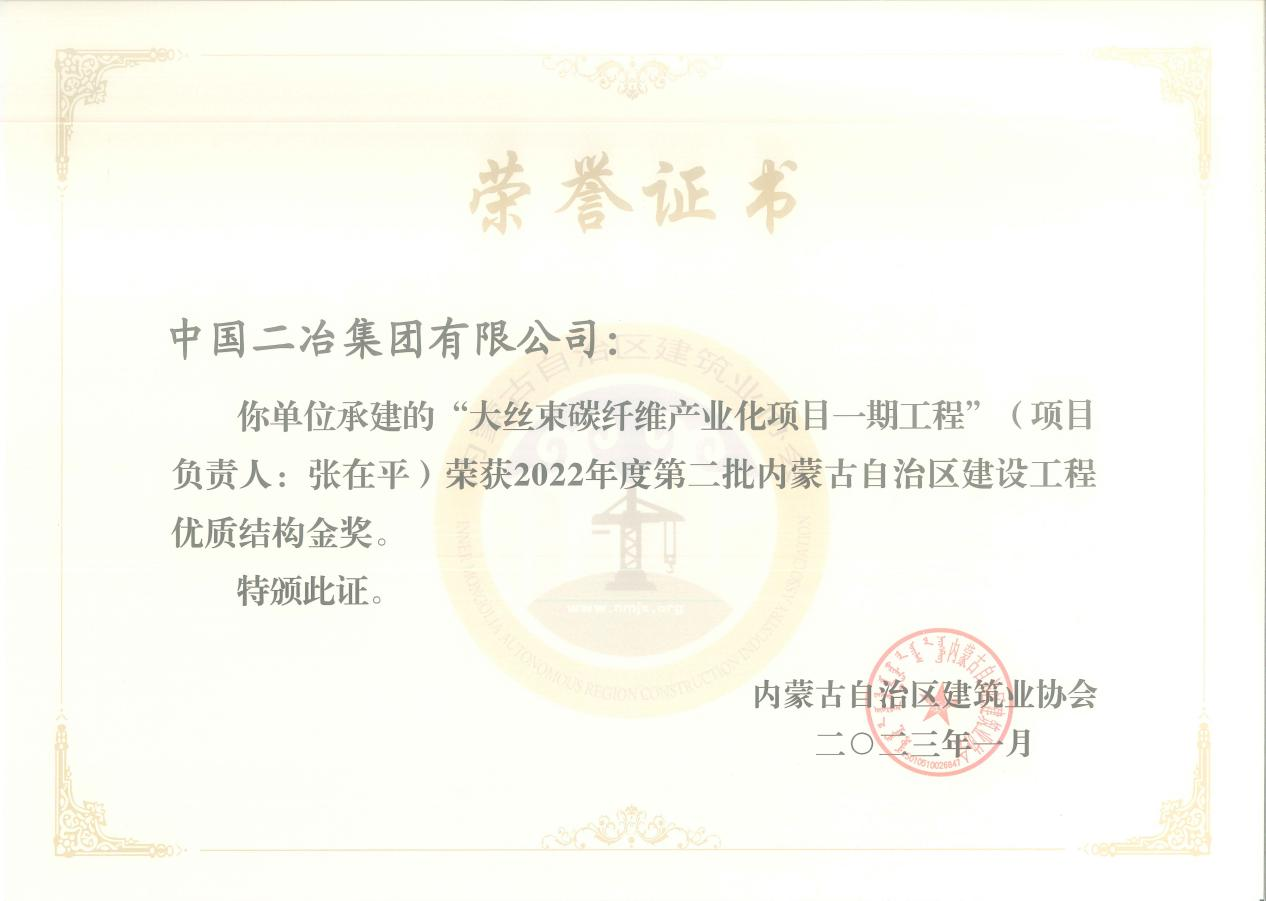3月29日,中國二冶收到內蒙古自治區建筑業協會榮譽證書,公司五個項目榮獲2022年度內蒙古自治區建設工程優質結構金獎、銀獎。實訓基地項目和大絲束碳纖維產業化項目一期工程分別獲得2022年度第一批和第二批內蒙古自治區建設工程優質結構金獎;水泊東岸項目、包頭市九原醫院項目、中冶德賢公館項目獲2022年度第二批內蒙古自治區建設工程優質結構銀獎。