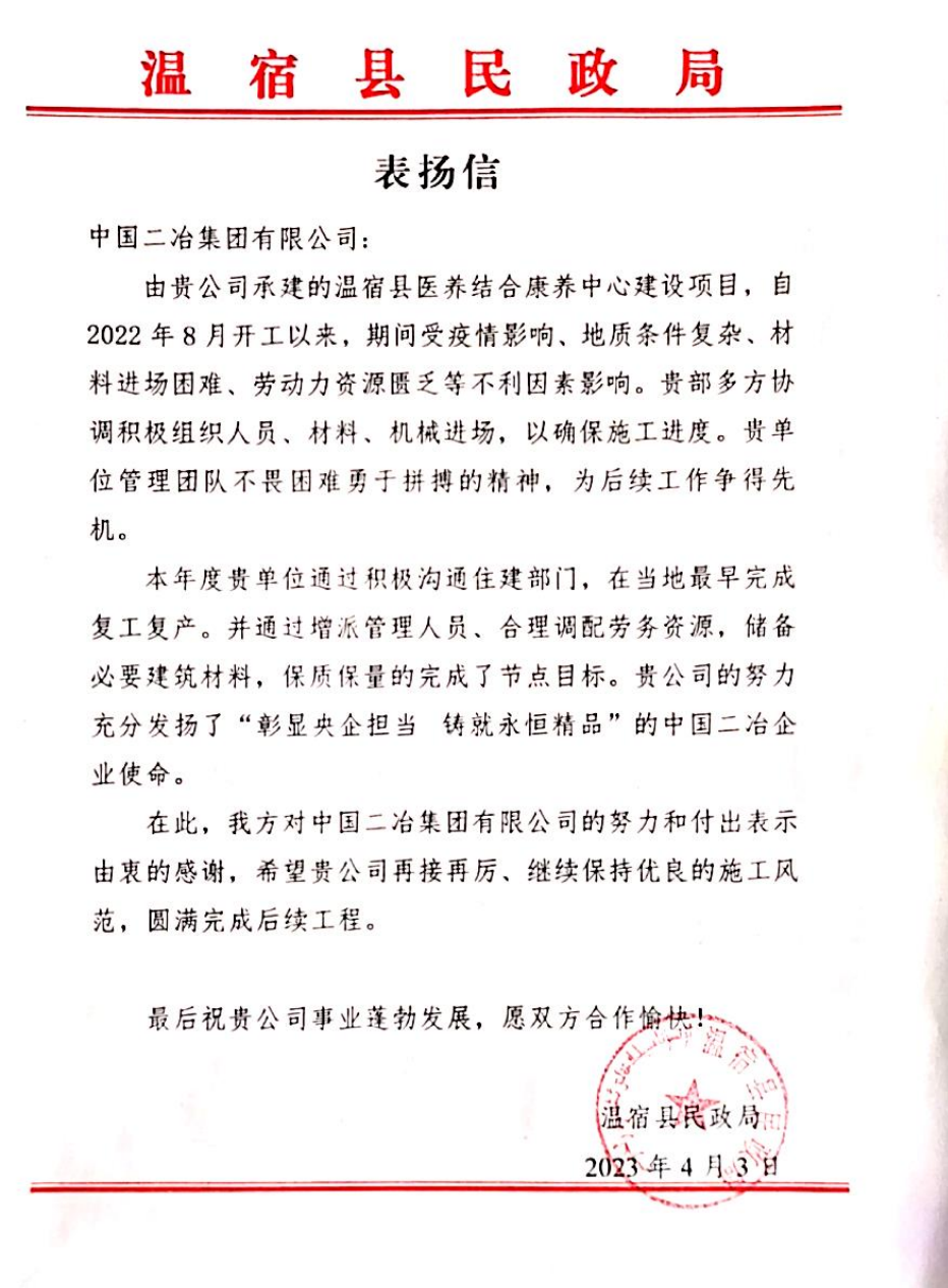 4月11日,中國二冶收到新疆阿克蘇地區(qū)溫宿縣民政局表揚(yáng)信,對溫宿縣醫(yī)養(yǎng)結(jié)合康養(yǎng)中心建設(shè)項(xiàng)目在施工過程中高效率、高質(zhì)量完成節(jié)點(diǎn)目標(biāo)表示高度肯定,對溫宿項(xiàng)目建設(shè)過程中不畏困難勇于拼搏的精神進(jìn)行贊揚(yáng)。