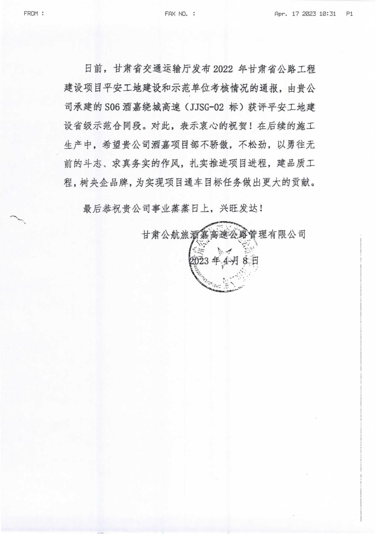 表揚信指出,甘肅省交通運輸廳發布2022年甘肅省公路工程建設項目平安工地建設和示范單位考核情況的通報,中國二冶酒嘉項目部獲評平安工地建設省級示范合同段。對此,酒嘉高速公路管理有限公司表示衷心的祝賀!