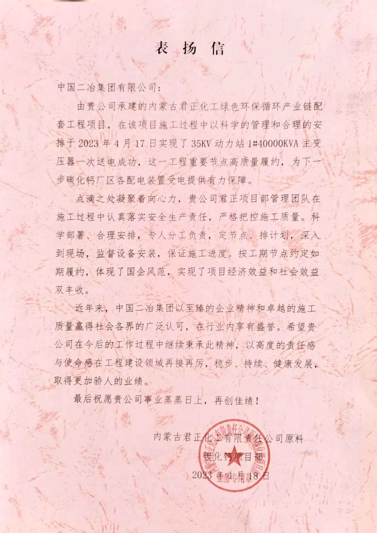 表揚信中指出,君正項目在施工過程中以科學的管理和合理的安排于2023年4月17日實現(xiàn)了35KV動力站1#40000KVA主變壓器一次送電成功,該重要節(jié)點的高質(zhì)量履約,為下一步碳化鈣廠區(qū)各配電裝置受電提供了有力保障。