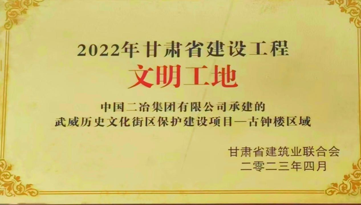 4月25日,甘肅省建筑業聯合會公布2022年甘肅省建筑工程文明工地、綠色建造施工水平評價合格項目評選結果,中國二冶承建的武威歷史文化街區保護建設項目榮獲2022年度甘肅省級文明工地及省級綠色建造工地榮譽稱號。