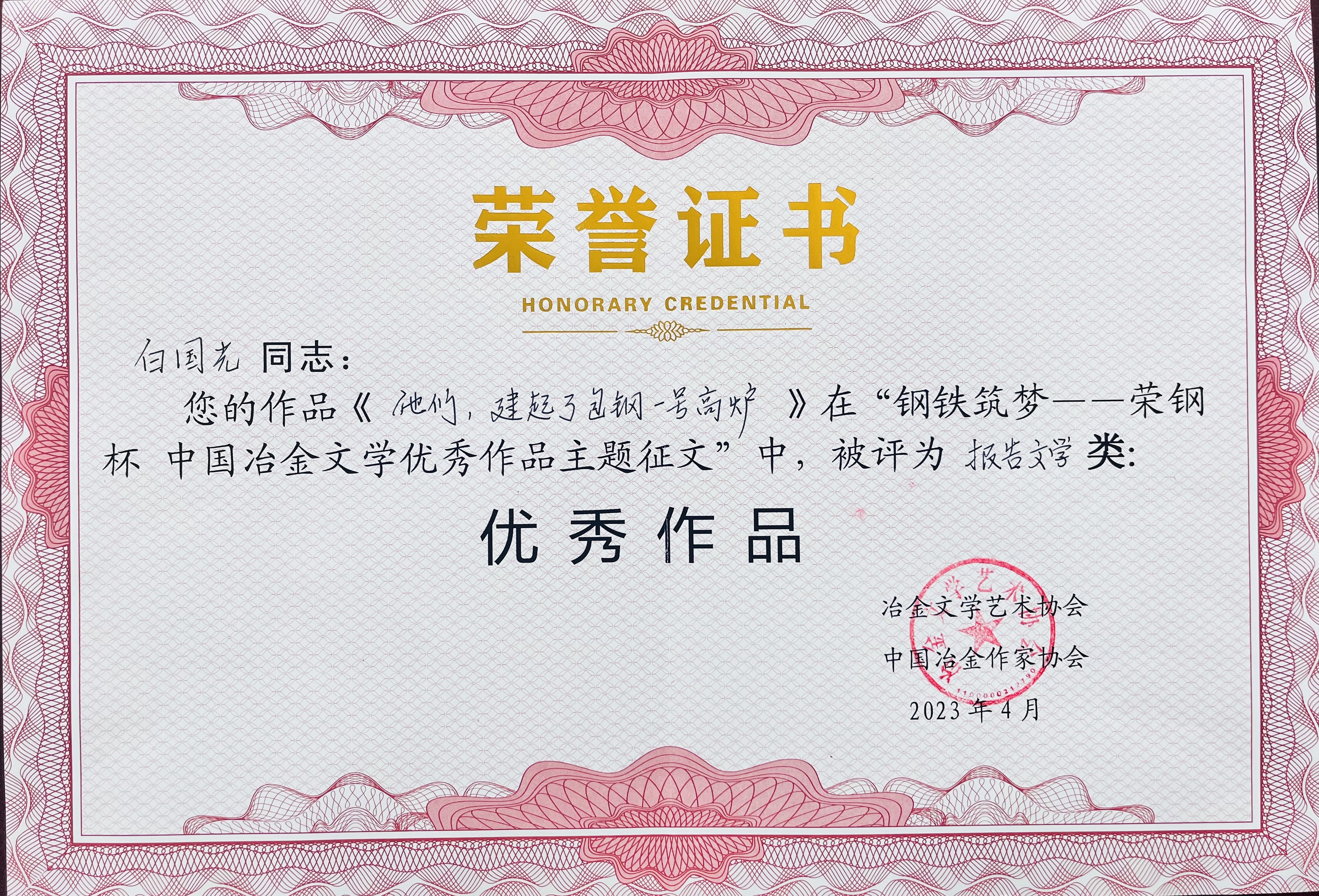 近日,由冶金文學藝術協會、中國冶金作家協會舉辦的“鋼鐵筑夢——榮鋼杯”中國冶金文學優秀作品主題征文評選結果揭曉,中國二冶在此次活動中榮獲優秀組織獎,原四川分公司職工白國光創作的《他們,建起了包鋼一號高爐》被評為報告文學類優秀作品。