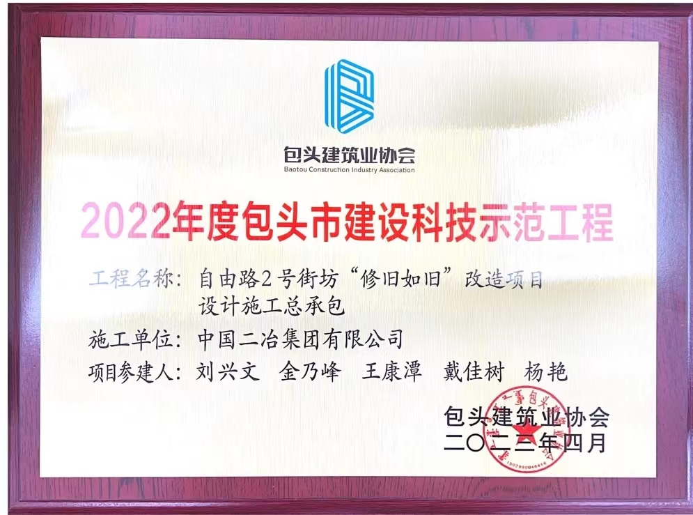5月28日,中國二冶收到包頭市建筑業(yè)協(xié)會頒發(fā)的榮譽證書,中國二冶承建的米蘭春天房地產(chǎn)項目續(xù)建工程、大地熊(包頭)科技有限公司5000噸高端制造高性能稀土永磁材料及器件工業(yè)項目、自由路2號街坊“修舊如舊”改造項目設(shè)計施工總承包項目榮獲“2022年度包頭市建設(shè)科技示范工程”。