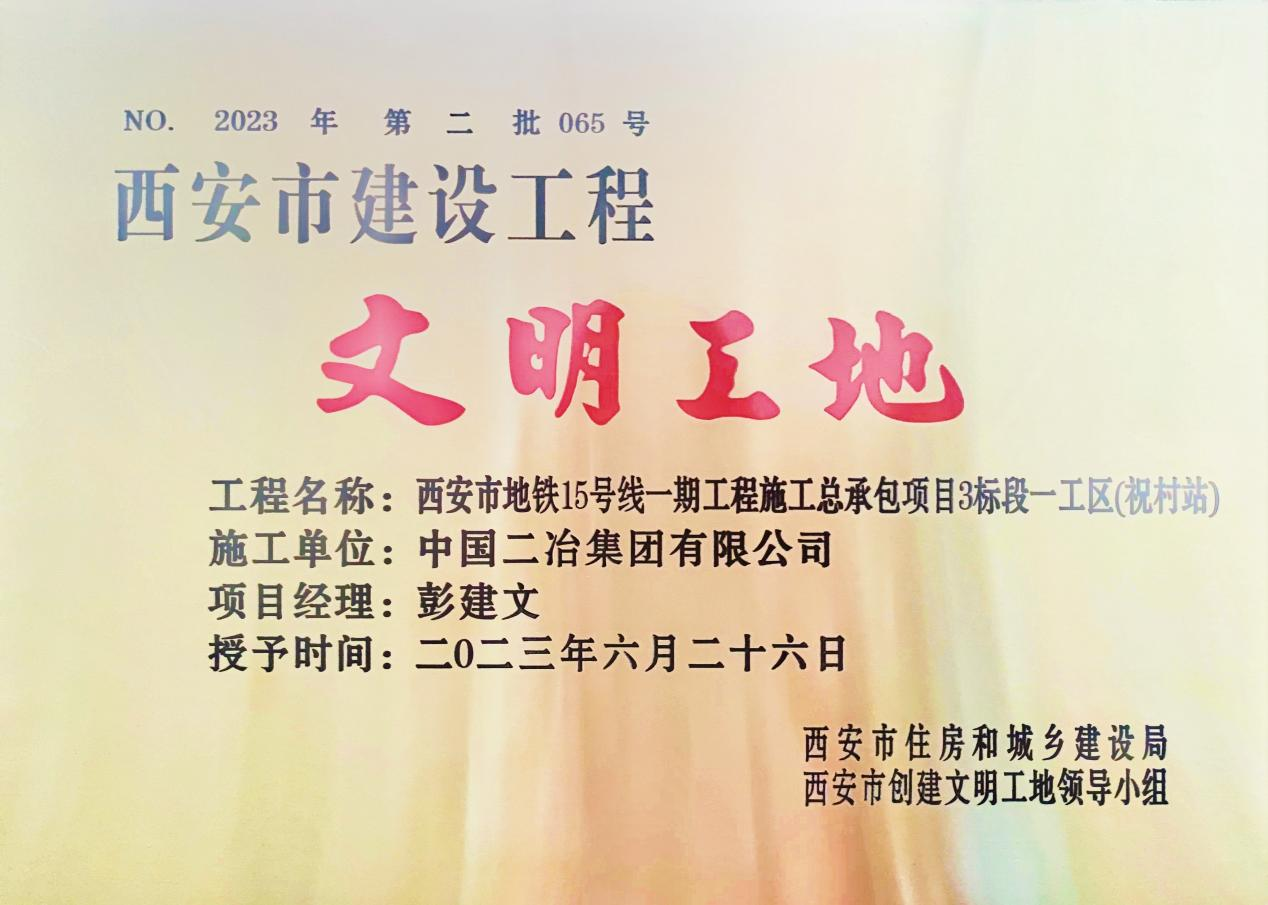 7月17日,中國二冶收到西安市住房和城鄉(xiāng)建設局頒發(fā)的獲獎證書和獎牌,由中國二冶承建的西安市地鐵15號線一期工程施工總承包項目3標段一工區(qū)(祝村站)榮獲“西安市文明工地”榮譽稱號。
