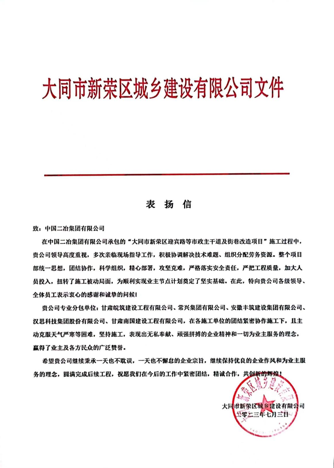 7月19日,中國(guó)二冶收到大同市新榮區(qū)城鄉(xiāng)建設(shè)有限公司表?yè)P(yáng)信,對(duì)大同市新榮區(qū)迎賓路等市政主干道及街巷改造項(xiàng)目高質(zhì)量完成節(jié)點(diǎn)任務(wù)表示贊許。