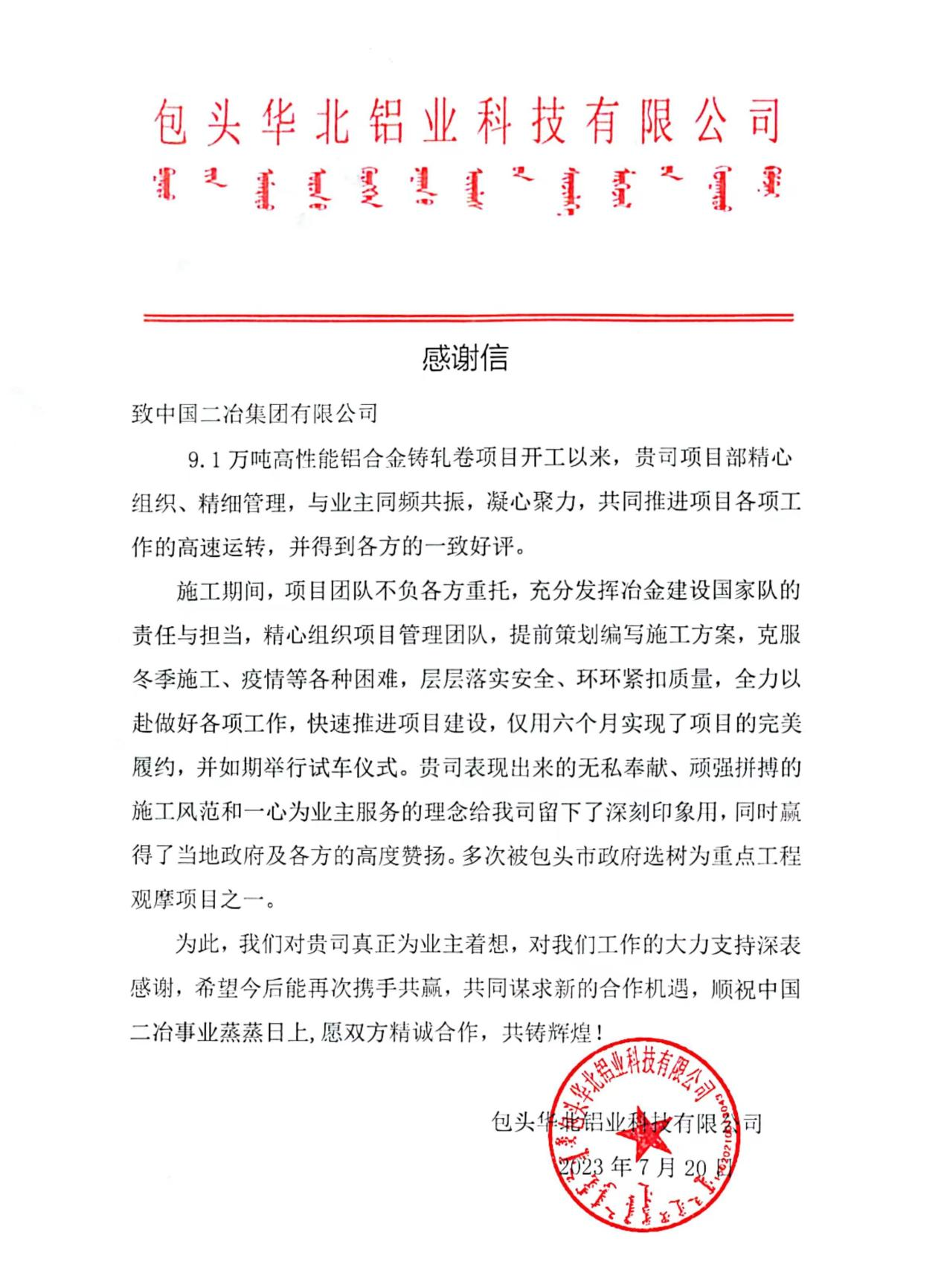 7月20日,中國二冶收到來自包頭華北鋁業科技有限公司的感謝信,信中對中國二冶承建的包鋁9.1萬噸高性能鋁合金鑄軋卷項目做出的貢獻表示感謝。