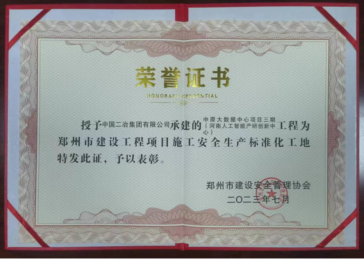 7月22日,由中國二冶中原分公司承建的中原大數據中心項目三期(河南人工智能產研創新中心)建筑工程施工總承包項目經理部獲評鄭州市2023年建設工程項目施工安全生產標準化工地稱號。
