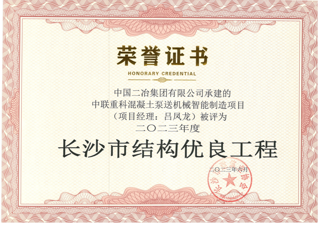 7月26日,長沙市建筑業協會發布“長沙市結構優良工程”評選結果公告,由中國二冶承建的中聯重科混凝土泵送機械智能制造項目榮獲2023年度“長沙市結構優良工程”榮譽。