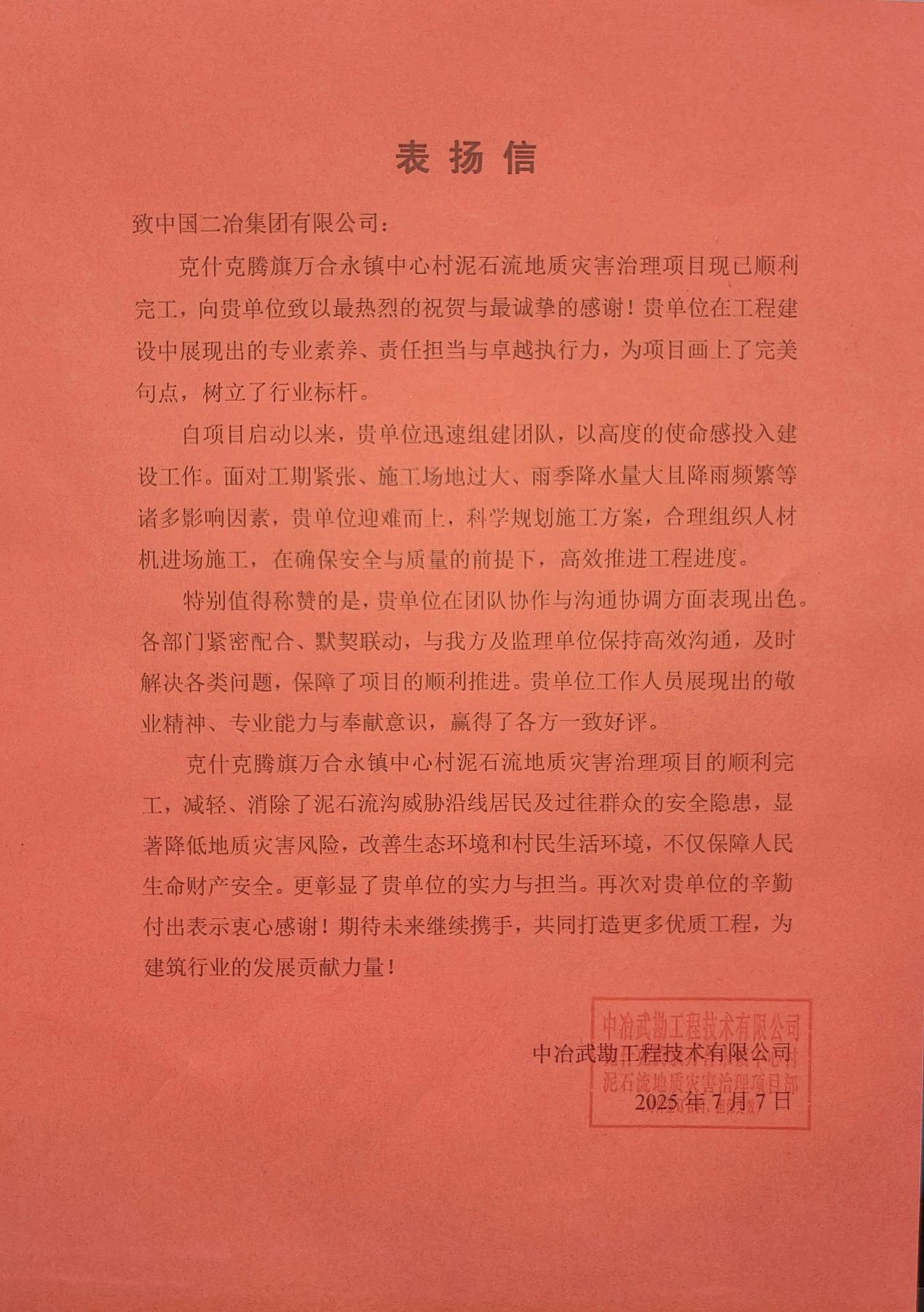 7月7日,中國二冶收到中冶武工程技術有限公司表揚信揚中國二冶在克什克騰旗萬合永鎮中心村泥石流地質災害治理項目建設中展現出的卓越專業素養、高度責任擔當和強大執行力,為項目的順利完工和取得顯著成效作出了重要貢獻。