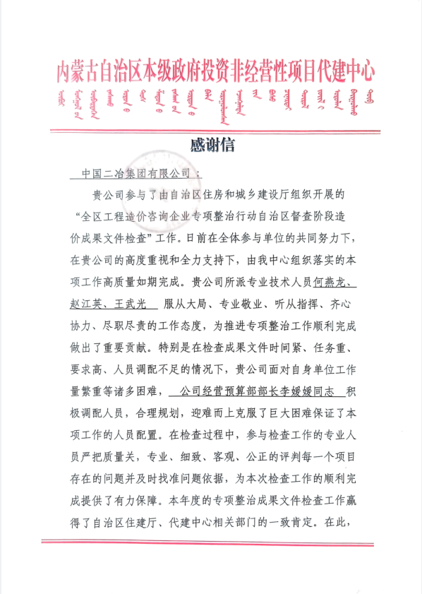 中國二冶獲內(nèi)蒙古代建中心感謝信